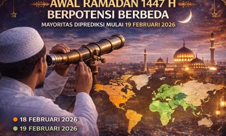 Awal Ramadan 1447 Hijriah diperkirakan tidak seragam di dunia Islam. Perhitungan astronomi menunjukkan sebagian negara kemungkinan memulai puasa pada 18 Februari 2026, sementara mayoritas mengarah ke 19 Februari 2026 akibat perbedaan metode rukyat dan hisab.