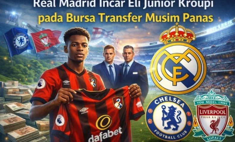 Real Madrid mengarahkan radar kepada Eli Junior Kroupi untuk memperkuat lini serang musim depan. Klub raksasa Spanyol itu mencari opsi tambahan di sektor depan dan menilai penyerang muda Bournemouth tersebut sebagai investasi menjanjikan.