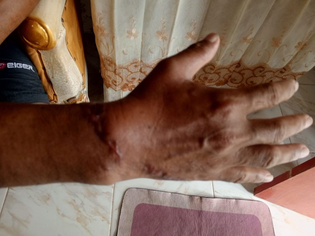 ” Kita kasiang cuma mo minta keadilan….tolong akang pak, sampe skarang kita pe luka manucu kong ja kaluar nanah mo suka pigi rumah sakit pa dokter bedah kasiang mar so nyandak ada doi “. Ujar AY dengan wajah memelas.