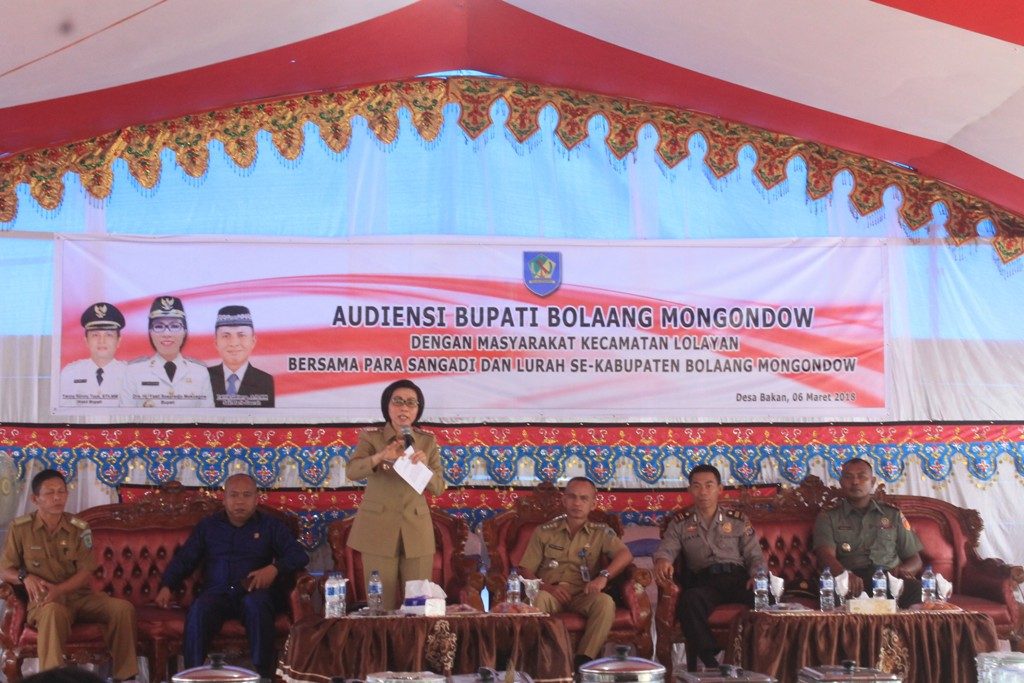 BOLMORA, ADVERTORIAL – Bupati Kabupaten Bolaang Mongondow (Bolmong) Yasti Soeprejo Mokoagow, Senin (5/3) melakukan audiens dan penyerahan 3000 sertifikat pendaftaran tanah sistematis lengkap (PTSL) tahun 2017 se-Kabupaten Bolmong, yang dilaksanakan di Desa Pusiaan Induk, Kecamatan Dumoga. Audiens dilanjutkan pada Selasa (6/3/18), bersama masyarakat Desa Bakan, Kecamatan Lolayan.