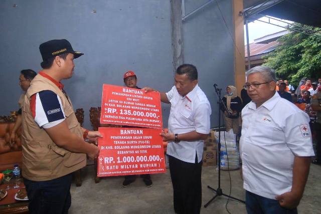 Di waktu dan kesempatan itu pula, wakil gubernur menyerahkan secara simbolis bantuan berupa sembako dan beberapa perlengkapan yang dibutuhkan warga, seperti bantuan penerangan jalan umum (PJU) tenaga surya sebanyak 40 titik senilai Rp1.000.000.000, pemasangan listrik gratis 450 Watt untuk 50 rumah warga kurang mampu senilai Rp135.000.000, dan bantuan alat alkon dari PT. Bank Sulutgo dan PT. Conch.