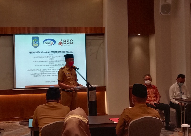 Penandatanganan kerja sama yang bertempat di Hotel Four Point itu dilakukan guna pemanfaatan aplikasi kas daerah secara online, sistem yang terintegrasi dengan aplikasi SIMDA keuangan, dalam rangka peningkatan pelayanan pengelolaan keuangan di lingkup Pemkab Bolsel.