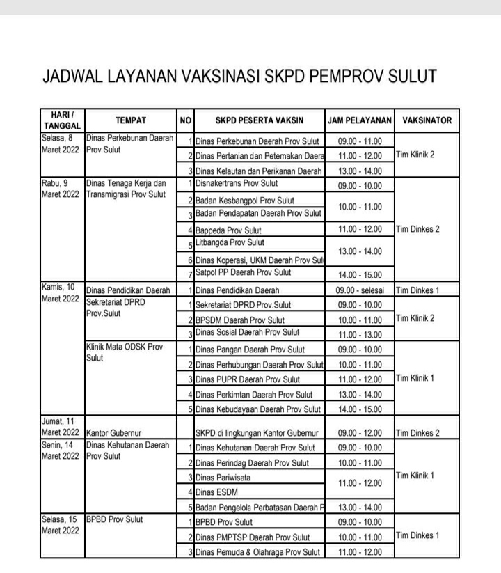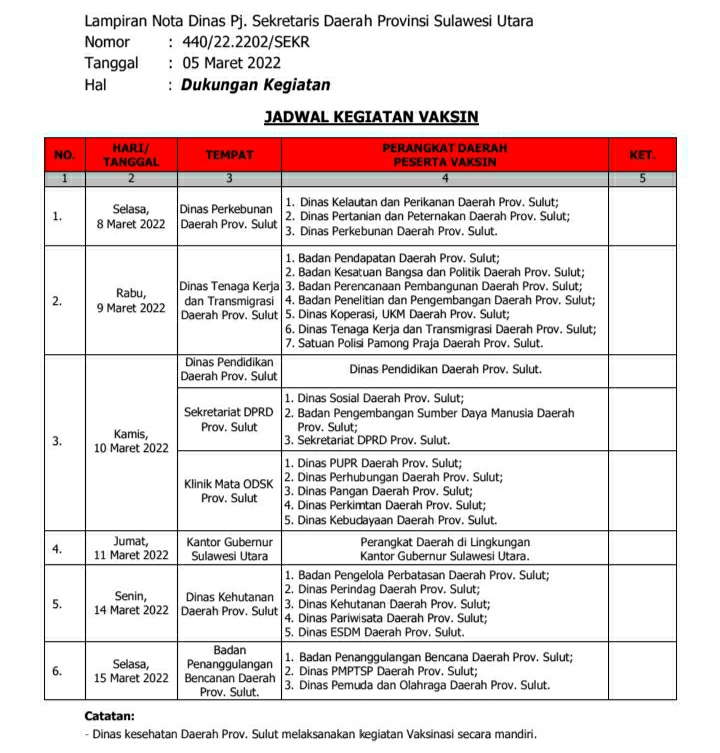 Dalam Nota Dinas yang ditujukan kepada para Kepala Perangkat Daerah dan Kepala Biro di lingkungan Pemprov Sulut tersebut, supaya menginstruksikan kepada seluruh ASN/THL di lingkungan instansi masing-masing agar mengikutsertakan anggota keluarga yang belum melaksanakan vaksinasi (Tahap I, II dan Booster), untuk mengikuti vaksinasi massal sebagaimana pengaturan waktu dan tempat pelaksanaan.