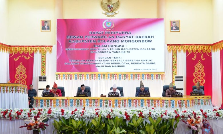 BOLMONG — Dewan Perwakilan Rakyat Daerah (DPRD) Kabupaten Bolaang Mongondow menggelar rapat paripurna istimewa dalam rangka peringatan Hari Ulang Tahun ke-70 Senin 25 Maret 2024.