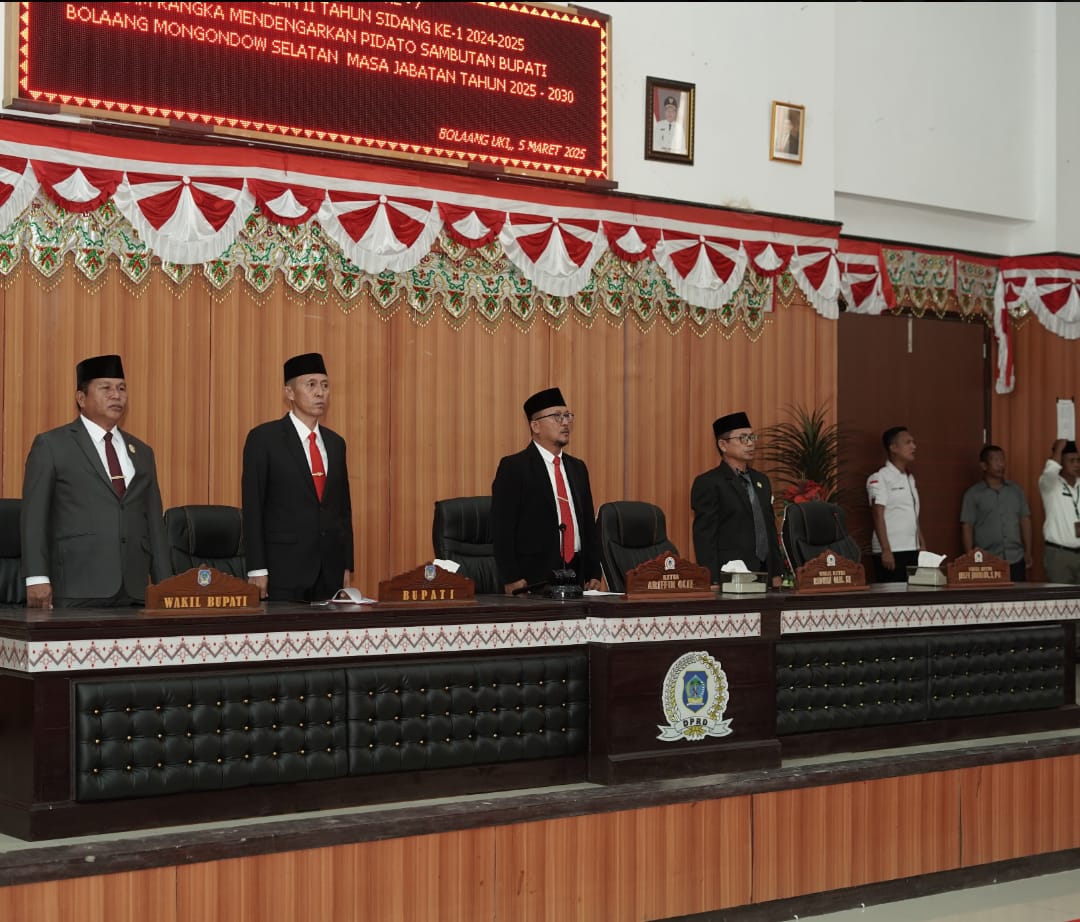 BOLSEL, Bolmora.com – Dewan Perwakilan Rakyat Daerah (DPRD) Kabupaten Bolaang Mongondow Selatan (Bolsel) menggelar Rapat Paripurna dalam rangka penyambutan secara adat sekaligus mendengarkan pidato perdana Bupati Bolsel periode 2025-2030.