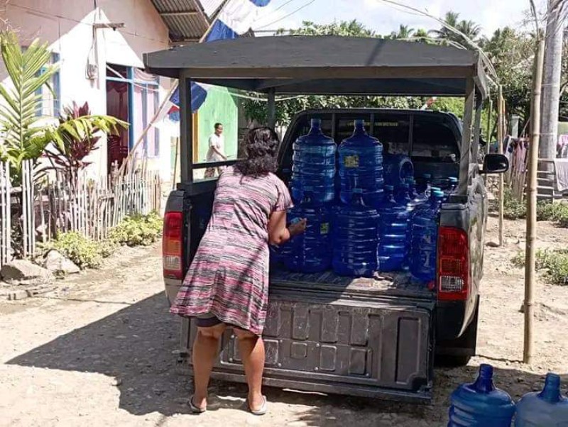 Bantuan air bersih tersebut disalurkan oleh Depot isi ulang San 3 Pondok Pesantren Miftahul Khoir Tebuireng VII Buyat.