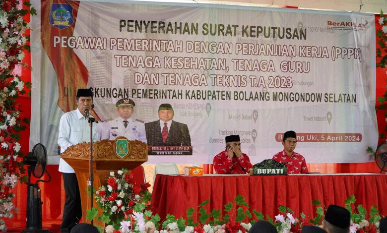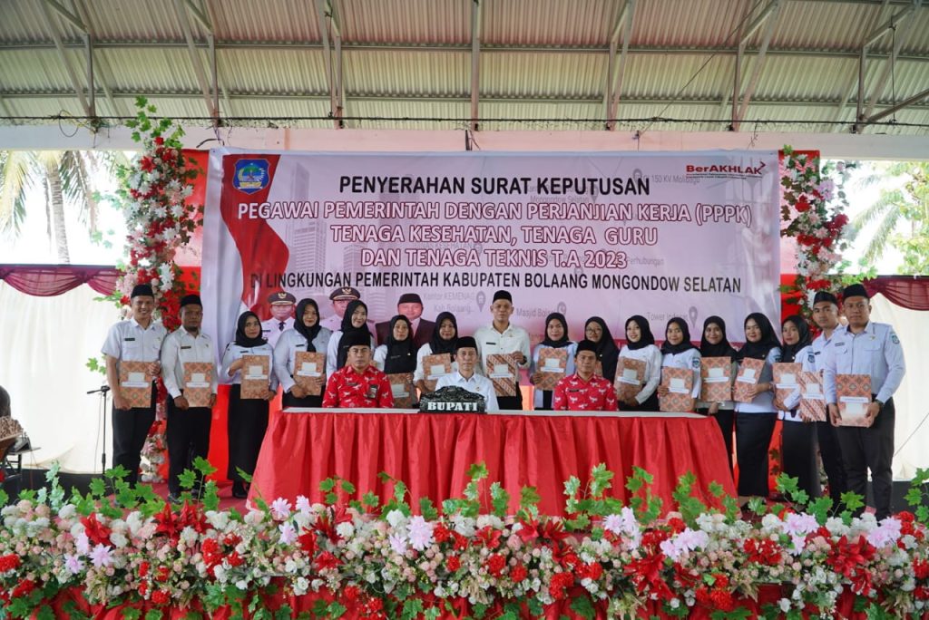 Bupati H. Iskandar Kamaru SPt, MSi menyerahkan langsung SK pengangkatan tersebut kepada 288 orang P3K Pemkab Bolsel T.A 2023 yang terdiri dari Tenaga Kesehatan, Tenaga Guru dan Tenaga Teknis dalam sebuah acara yang digelar di Lapangan Futsal Kawasan Perkantoran Panango, Kec. Bolaang Uki, Jumat (5/4/2024).