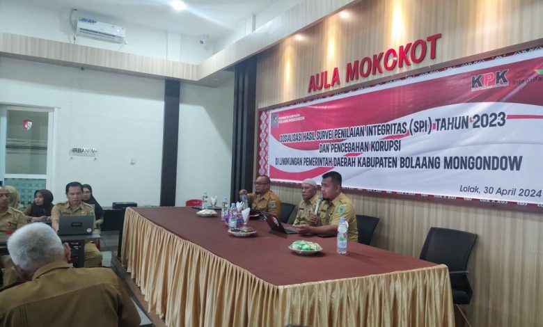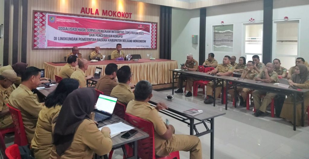 BOLMONG – Inspektorat Daerah Kabupaten Bolaang Mongondow (Bolmong) menggelar kegiatan sosialisasi hasil Survei Penilaian Integritas (SPI) tahun 2023 dan pencegahan korupsi melalui Monitoring Center for Prevention (MCP) tahun 2023 dan 2024 di lingkungan Pemerintah Kabupaten (Pemkab) Bolmong di Aula Mokokot Kantor Inspektorat Daerah Bolmong, Selasa 30 April 2024.