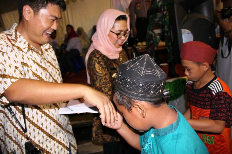 Usai buka puasa bersama, bupati membagikan zakat, sarung dan busana muslim kepada anak yatim dan kaum dhuafa.(adve/agung)