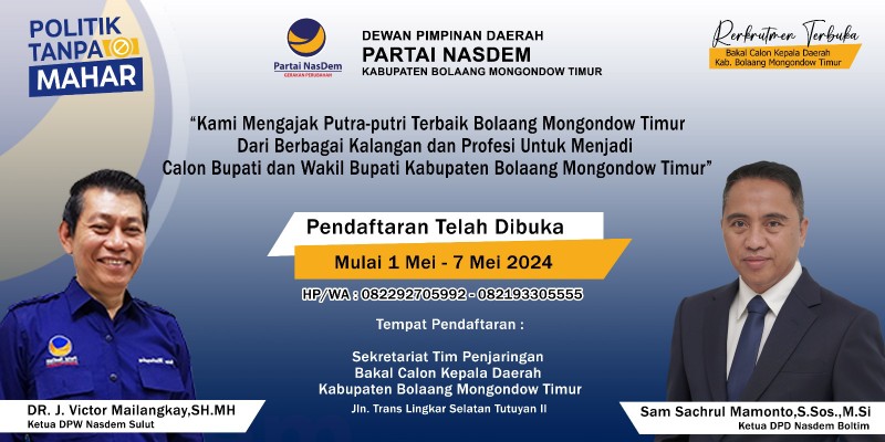 Menurut ketua tim penjaringan Abdul Kader Bachmid, pendaftaran bakal calon Bupati dan Wakil Bupati Boltim di Partai NasDem dibuka selama 1 minggu.