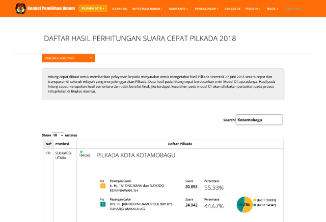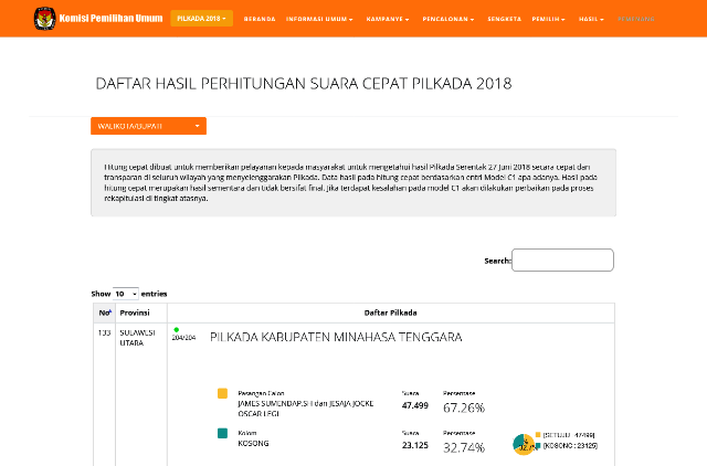 Adapun untuk mengetahui hasil perolehan suara pasangan calon di masing-masing daerah yang menggelar Pilkada dapat dilihat melalui link infopemilu.kpu.go.id/pilkada2018/hasil/cepat/t2/list/nasional