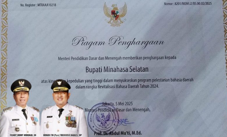 BOLMORA.COM, ADVERTORIAL – Pemerintah Kabupaten Minahasa Selatan kembali menorehkan prestasi di tingkat Nasional, di mana Kementerian Pendidikan Dasar dan Menengah Republik Indonesia menganugerahkan Piagam Penghargaan kepada Bupati Minahasa Selatan. Franky Donny Wongkar, SH., atas kinerja dan kepedulian tinggi dalam menyukseskan program pelestarian bahasa daerah melalui Revitalisasi Bahasa Daerah tahun 2024.