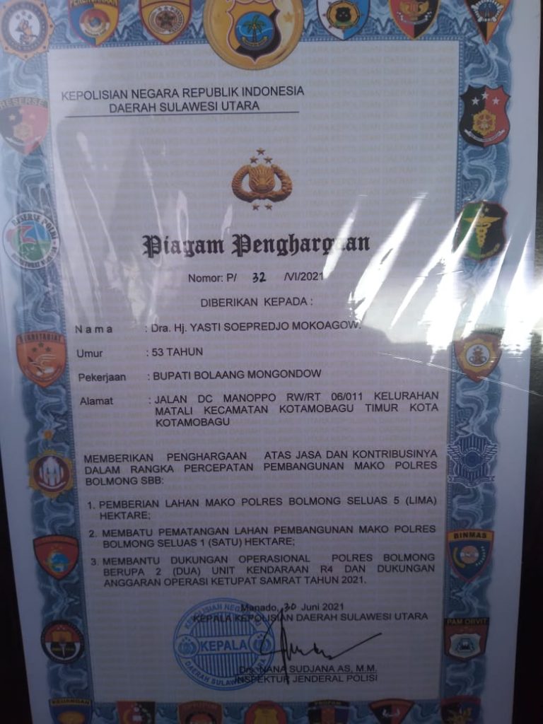 Tercantum dalam piagam penghargaan, Bupati Bolaang Mongondow berkontribusi dengan memberikan lahan Mako Polres Bolaang Mongondow seluas lima hektare.