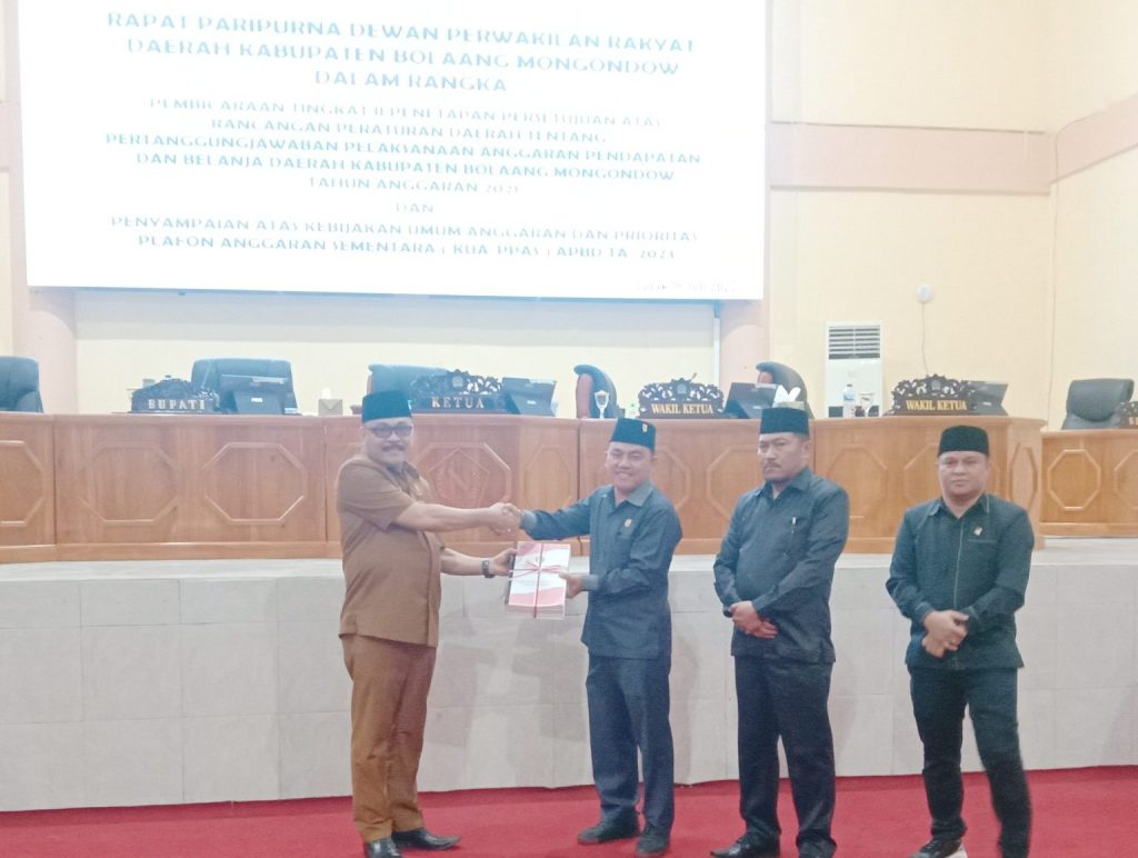 BOLMORA.COM, BOLMONG – Dewan Perwakilan Rakyat Daerah (DPRD) kabupaten Bolaang Mongondow (Bolmong) menggelar rapat paripurna dalam rangka pembicaraan tingkat II penetapan persetujuan atas rancangan peraturan daerah (Ranperda) tentang pertanggungjawaban pelaksanaan anggaran APBD Bolmong tahun anggaran 2021.