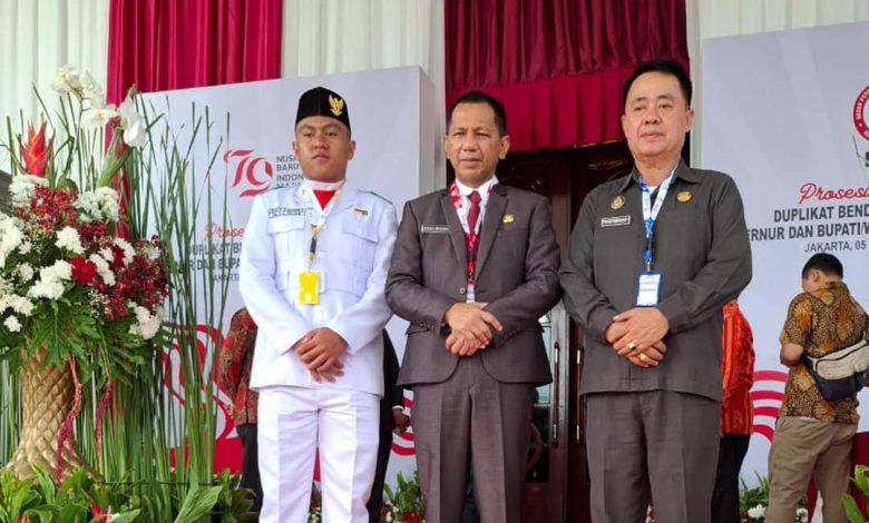 Dalam momen penyerahan duplikat Bendera Merah Putih, Pj Bupati dr. Jusnan C. Mokoginta didampingi oleh Sekretaris Daerah (Sekda) Abdullah Mokoginta dan Kepala Badan Kesbang dan Politik, Chris Kamasaan.