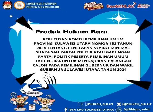 Adapun keputusan KPU Sulut tersebut tentang Penetapan Syarat Minimal Suara Sah Partai Politik atau Gabungan Partai Politik Peserta Pemilihan Umum Tahun 2024 untuk Mengajukan Pasangan Calon pada Pemilihan Gubernur dan Wakil Gubernur Sulawesi Utara tahun 2024.