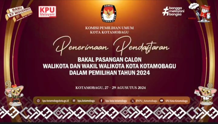 Perlu diketahui, pendaftaran bapaslon Wali Kota dan Wakil Wali Kota Kotamobagu di KPU Kota Kotamobagu dibuka selama tiga hari, yakni pada hari Rabu tanggal 27 sampai hari Kamis tanggal 29 Agustus 2024.
