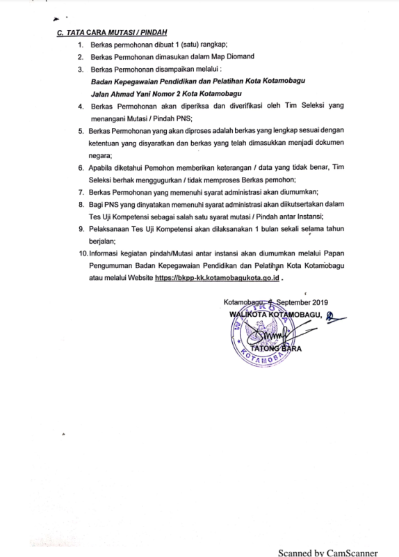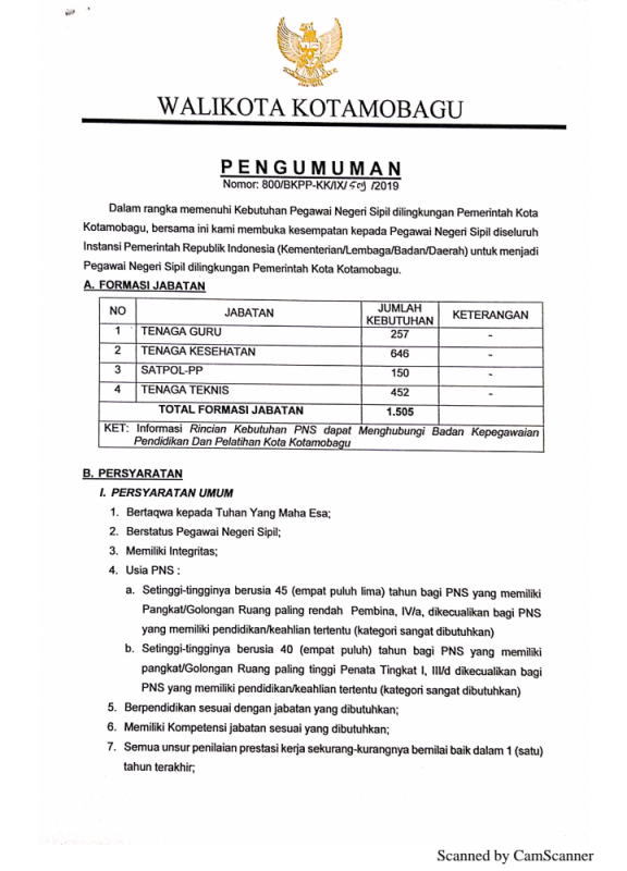 BOLMORA.COM, KOTAMOBAGU – Dalam rangka memenuhi kebutuhan Pegawai Negeri Sipil (PNS) di lingkungan Pemerintah kota (Pemkot) Kotamobagu, Pemkot membuka kesempatan bagi PNS di seluruh Instansi Pemerintah untuk menjadi PNS di Kota Kotamobagu.Hal tersebut berdasarkan pengumuman nomor 800/BKPP-KK/IX/509/2019, yang dikeluarkan Badan Kepegawaian Pendidikan dan Pelatihan (BKPP) Kota Kotamobagu.