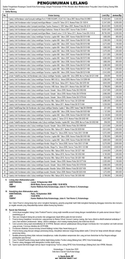 Berikut daftar kendis yang akan dilelang oleh Pemkot Kotamobagu