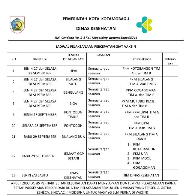 Berikut jadwal lokasi pelaksanaan vaksinasi di wilayah Kotamobagu: