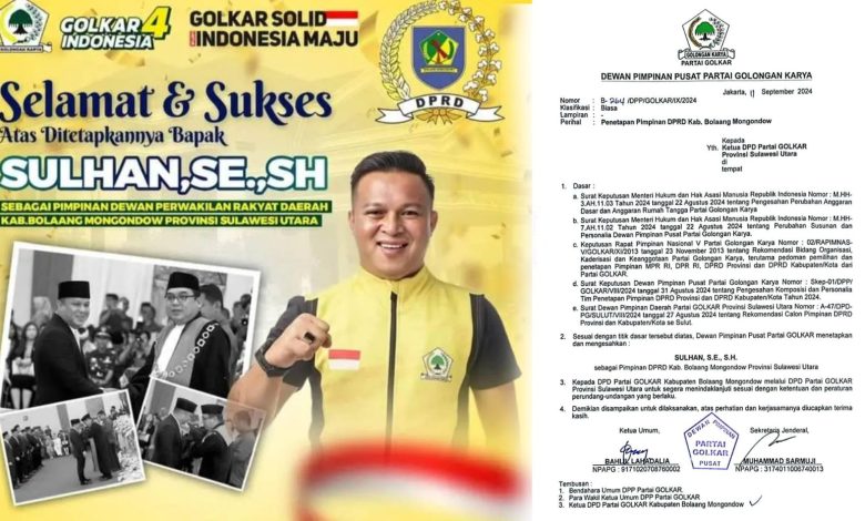 Surat tersebut yang diterbitkan 11 September 2024 tersebut berisi tentang DPP Partai Golkar yang menetapkan dan mengesahkan Sulhan Manggabarani S.E, S.H sebagai pimpinan DPRD Kabupaten Bolmong.