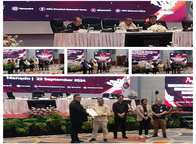 Pun dilakukan penyerahan Surat Keputusan Penetapan Pasangan Calon Pemilihan Gubernur dan Wakil Gubernur Sulawesi Utara Tahun 2024 kepada ketiga Paslon melalui para Liaison Officer (LO) atau penghubung, Minggu (22/9/2024) di Hotel Fourpoint By Sheraton Manado.