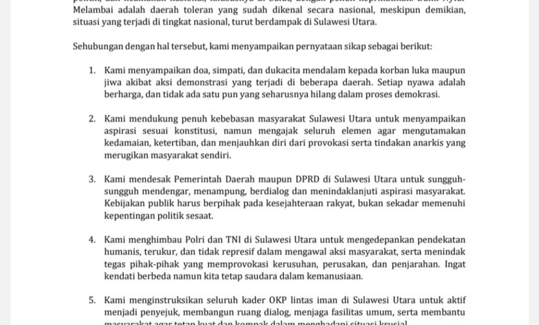 4. Kami menghimbau Polri dan TNI di Sulawesi Utara untuk mengedepankan pendekatan humanis, terukur, dan tidak represif dalam mengawal aksi masyarakat, serta menindak tegas pihak-pihak yang memprovokasi kerusuhan, perusakan, dan penjarahan. Ingat kendati berbeda namun kita tetap saudara dalam kemanusiaan.