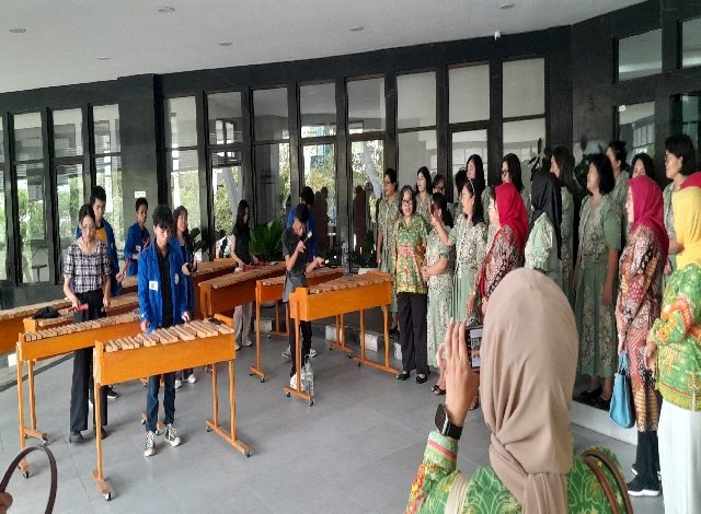 Kehadiran rombongan disambut Dharma Wanita Polimdo dengan iringan musik kolintang dari para mahasiswa Polimdo.