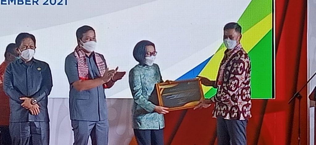 Penyerahan penghargaan yang diterima Bupati Bolmong Yasti Soepredjo Mokoagow disaksikan Wakil Gubernur Sulut Steven Kandouw, Forkopimda Sulut serta para Bupati dan Wali Kota se- Sulut.