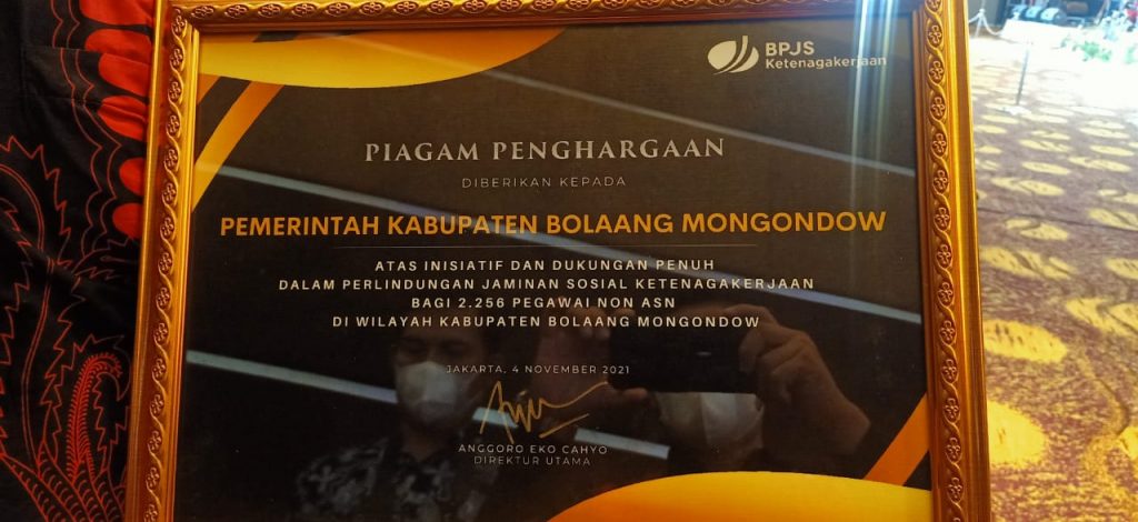 Penghargaan tersebut diterima Bupati Bolmong Yati Soepredjo Mokoagow atas insentif dan dukungan penuh dari pemerintah daerah dalam memberikan perlindungan jaminan sosial ketenagakerjaan kepada 2.256 pegawai non ASN di Kabupaten Bolmong.