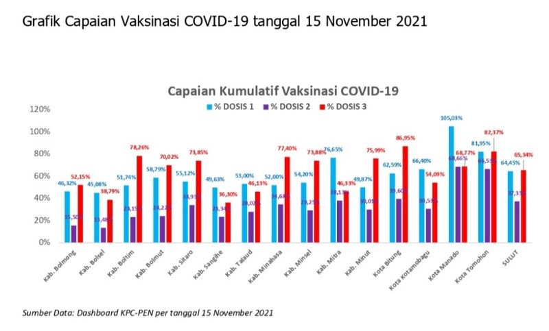 “Berdasarkan data kondisi epidemiologi COVID-19 Dinas Kesehatan Provinsi Sulut pertanggal 15 November 2021, capaian vaksinasi Lansia Bolmong baru mencapai 31,82 persen dan Boltim sudah mencapai 43,89 persen. Jika dibandingkan dengan data Vaksinasi Lansia di Bolmong, kita masih lebih tinggi. Pun demikian, dengan capaian vaksinasi dosis 1 Kabupaten Boltim sudah mencapai 51,74 persen, sedangkan Kabupaten Bolmong berada dibawah capaian Boltim dengan persentase 46,32 persen, namun Bolmong sudah ditetapkan sebagai daerah PPKM Level 2,” Terang Samsudin.