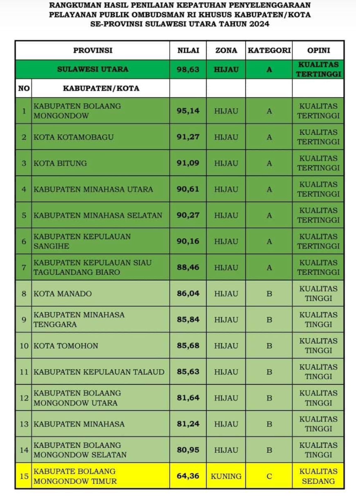Penganugrahan nilai evaluasi tertinggi kepada Pemkab Bolmong, dengan nilai 95,14 Zona Hijau Kategori A, dengan opini kualitas tertinggi ini berdasarkan keputusan Ketua Ombudsman RI No 252 Tahun 2024,