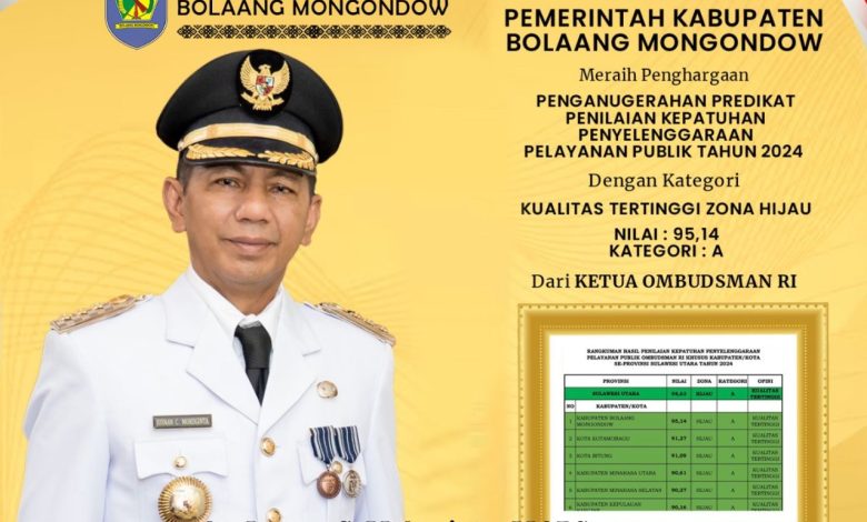 BOLMONG – Pemerintah Kabupaten (Pemkab) Bolaang Mongondow (Bolmong) mengukir prestasi dengan meraih prestasi di kegiatan Penganugerahan Penghargaan Kepatuhan Penyelenggaraan Pelayanan Publik oleh Ombudsman RI.