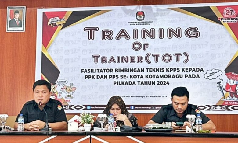 KOTAMOBAGU – Komisi Pemilihan Umum (KPU) Kota Kotamobagu melaksanakan Training of Trainer (ToT) untuk fasilitator bimbingan teknis (bimtek) Kelompok Penyelenggara Pemungutan Suara (KPPS) dalam rangka persiapan Pemilihan Kepala Daerah (Pilkada) 2024.