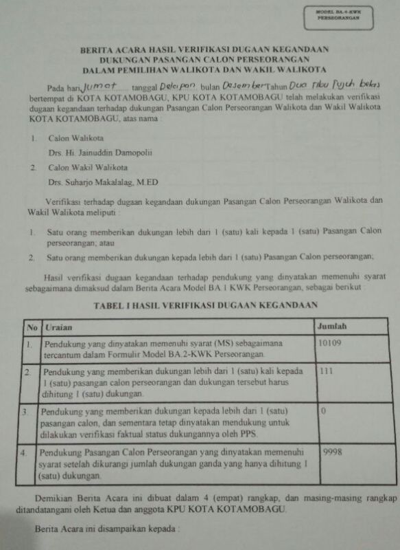 BOLMORA, POLITIK – Hasil penelitian administrasi yang dilakukan KPUD Kota Kotamobagu, terhadap berkas dukungan pasangan calon wali kota dan wakil wali kota yang maju melalui jalur perseorangan atau independen, yakni Jainuddin Damopolii dan Suharjo Makalalag (JaDi-Jo), berkurang 712 yang sebelumnya sebanyak 10.821. Hal itu diungkapkan Komisioner KPUD Kota Kotamobagu yang membidangi divisi data dan teknis Aditya Tegela, Jumat (8/12/2017) siang tadi.