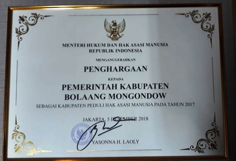 Penghargaan tersebut langsung diserahkan Menteri Hukum dan HAM Yasona Laoly, kepada Bupati Bolmong Yasti Soepredjo Mokoagow, di Kantor Kementerian Hukum dan HAM, Selasa (11/12/2018).