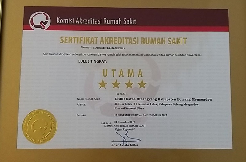 Hasil penilaian KARS Kemenkes RI menyebutkan, RSUD Datoe Binangkang berhasil mendapatkan predikat utama.