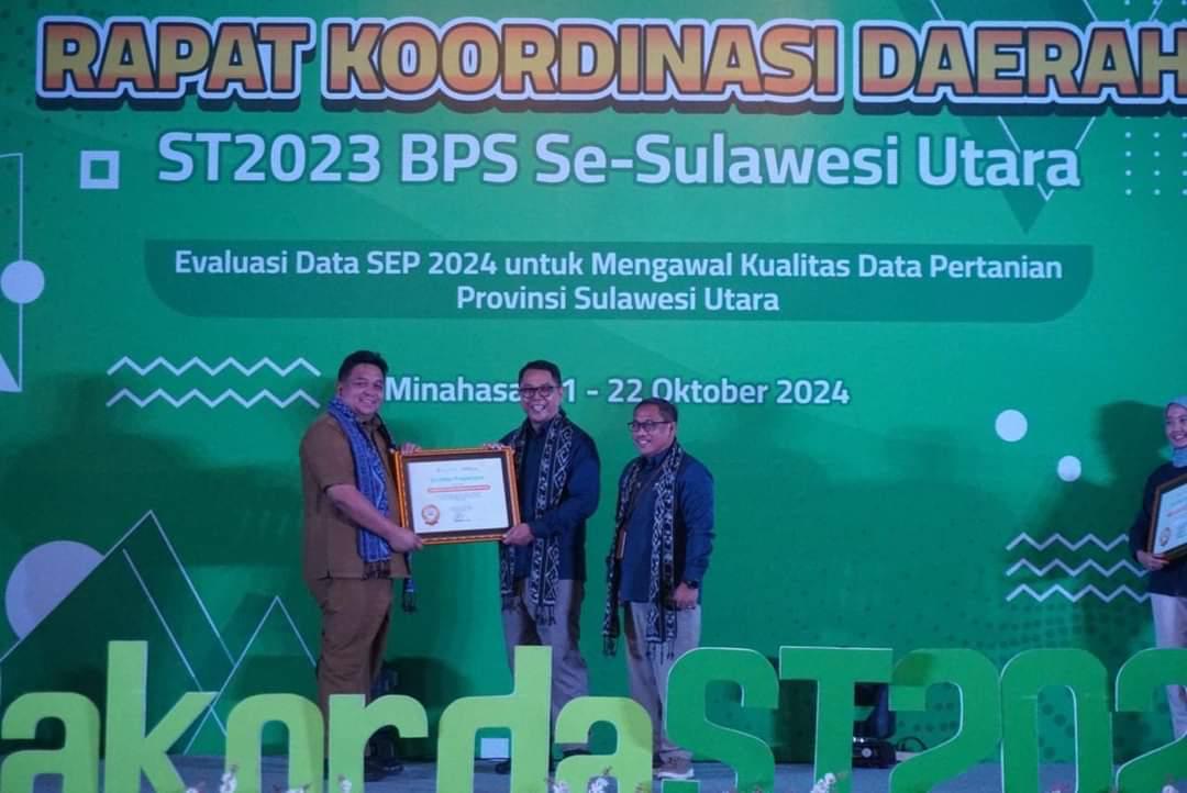 Dalam Rapat Koordinasi Daerah Sensus Pertanian 2023 (ST2023) yang digelar oleh Badan Pusat Statistik (BPS) Provinsi Sulawesi Utara Senin, (21/10), Kabupaten Minahasa Selatan dianugerahi penghargaan atas Evaluasi Penyelenggaraan Statistik Sektoral Periode Tahun 2024.