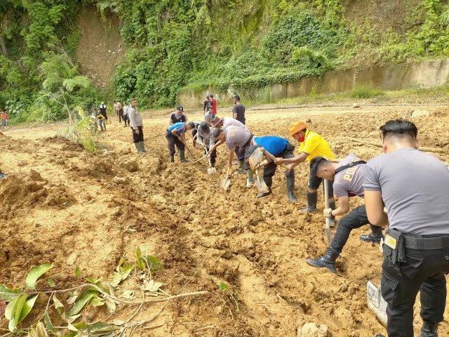 Turun ke Lokasi Longsor, Polres Boltim Bersihkan Ruas Jalan Desa Badaro